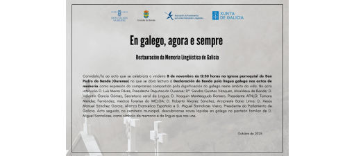 El 8 de noviembre se celebrará el acto oficial en el que se leerá la Declaración de Bande por la lengua gallega en los actos de memoria, en el que varios alcaldes y alcaldesas se comprometerán a promover la restauración de la memoria lingüística en sus municipios. La iniciativa busca visibilizar la importancia de emplear el gallego en los ritos funerarios y en las últimas voluntades.